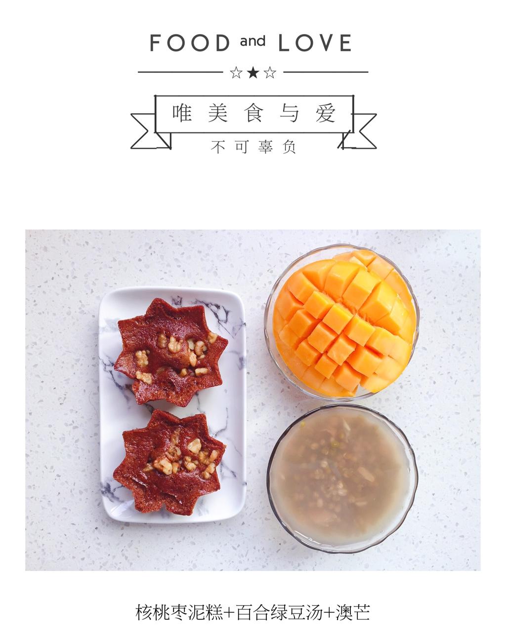早餐:核桃枣泥糕+百合绿豆汤+澳芒