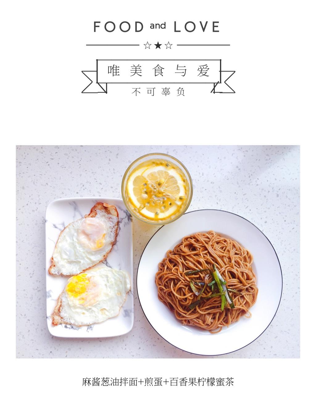 早餐:麻酱葱油拌面+煎蛋+百香果柠檬蜜茶