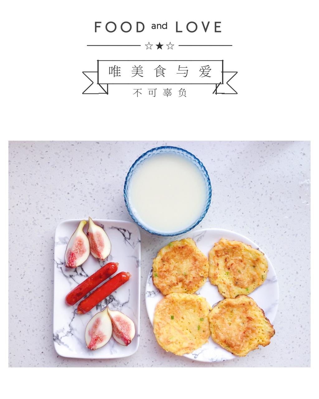 早餐:胡萝卜丝土豆饼+烤肠+热豆浆+无花果