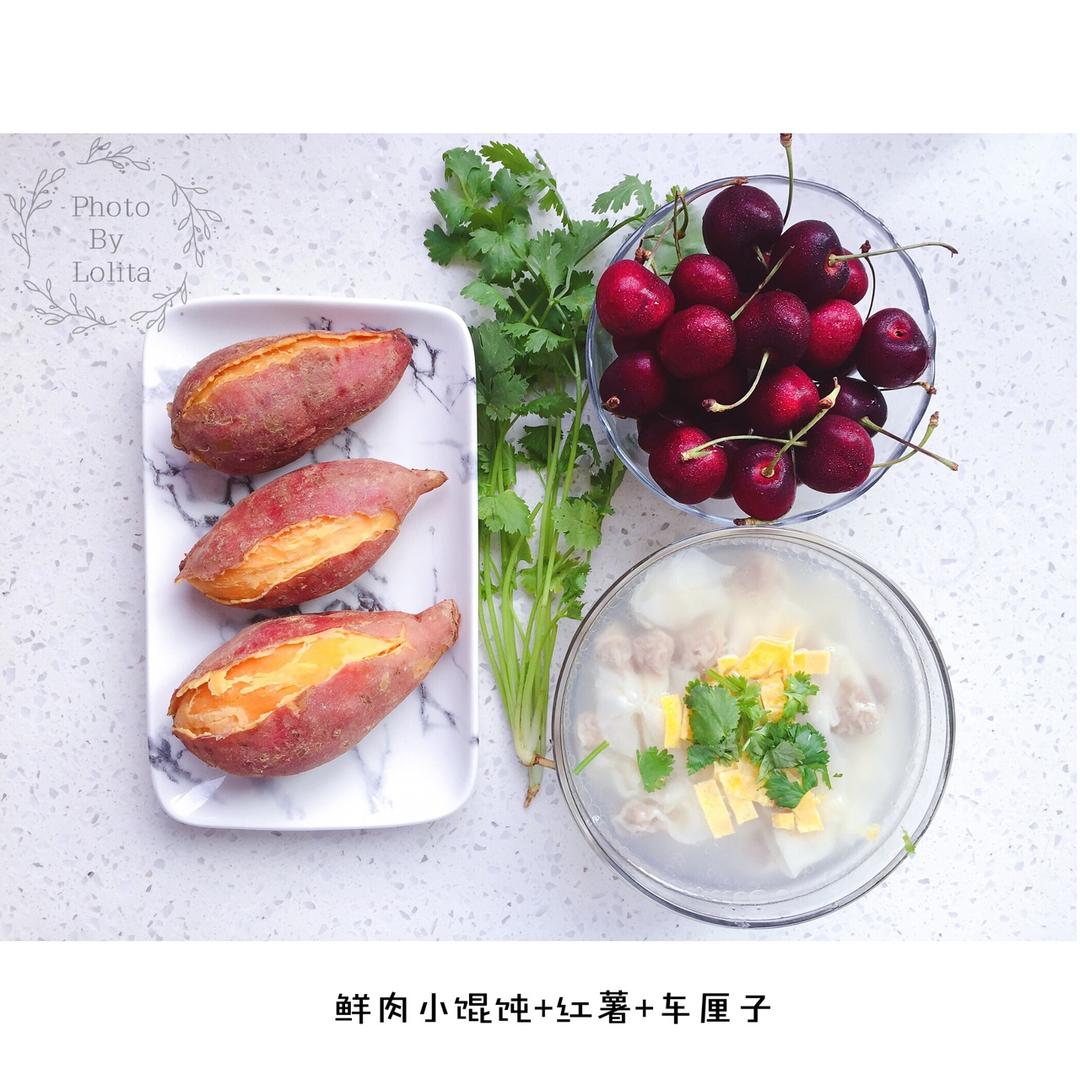 早餐:鲜肉小馄饨+红薯+车厘子