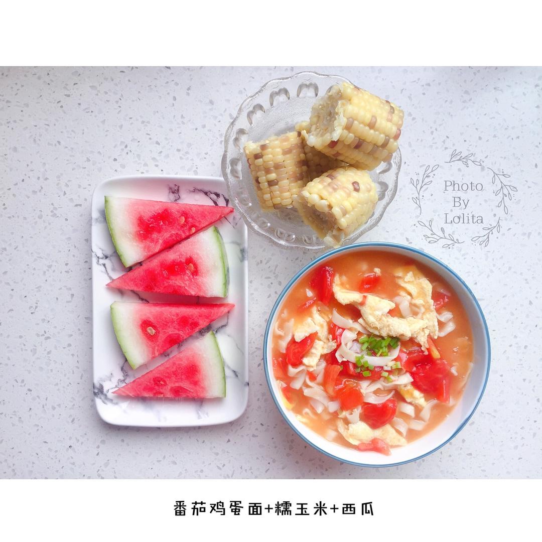 早餐:番茄鸡蛋面+糯玉米+西瓜