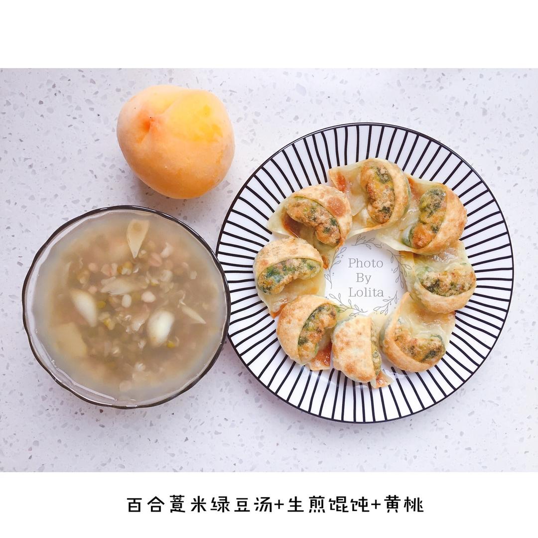 早餐:百合薏米绿豆汤+生煎馄饨+黄桃