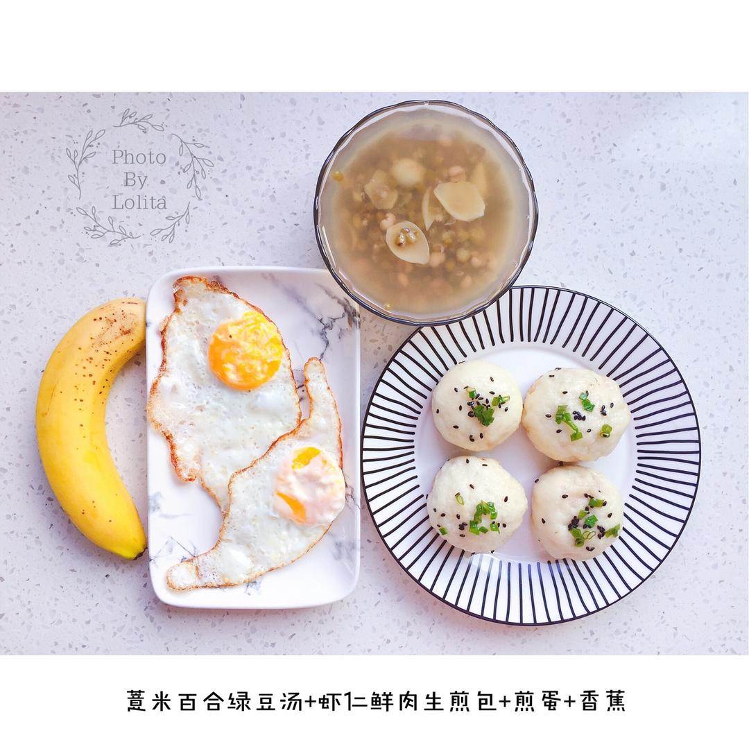 早餐:薏米百合绿豆汤+虾仁鲜肉生煎包+煎蛋+香蕉
