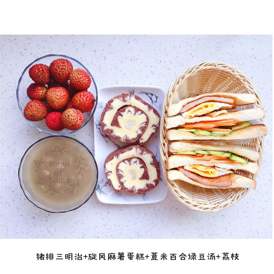早餐:猪排三明治+旋风麻薯蛋糕+薏米百合绿豆汤+甜杏