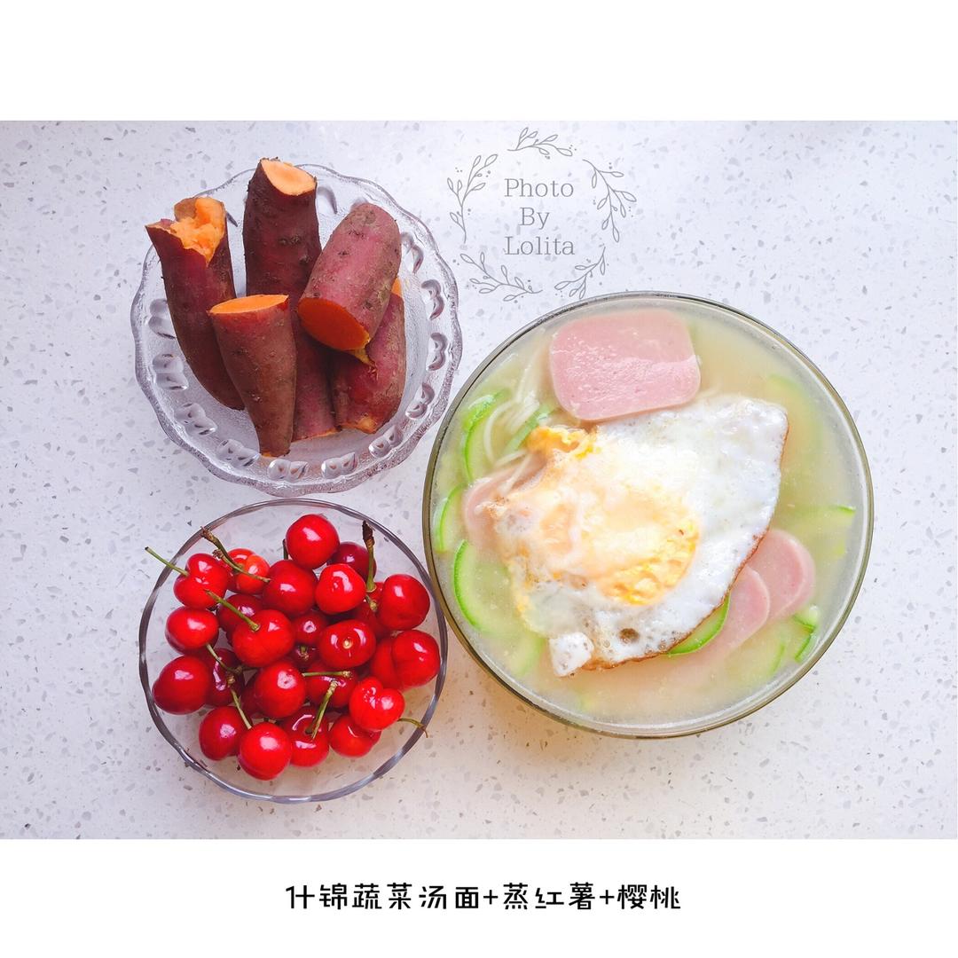 早餐:什锦蔬菜汤面+蒸红薯+樱桃