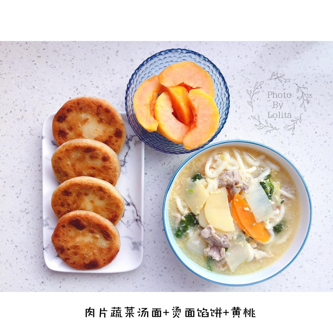 早餐:肉片蔬菜汤面+烫面馅饼+黄桃