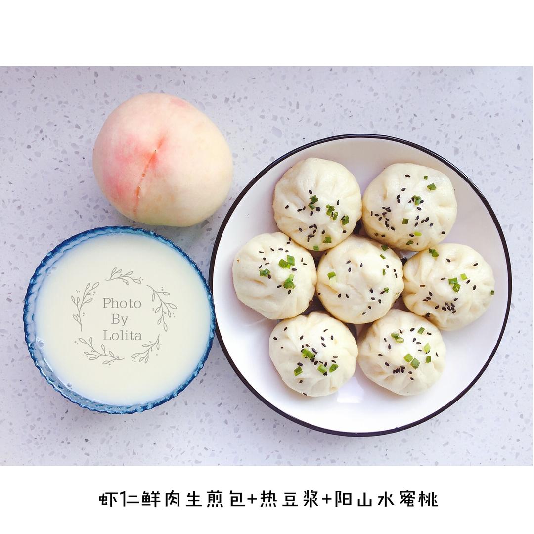 早餐:虾仁鲜肉生煎包+热豆浆+阳山水蜜桃