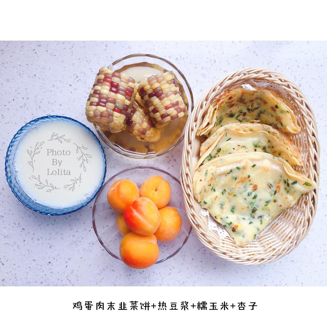 早餐:鸡蛋肉末韭菜饼+热豆浆+糯玉米+杏子