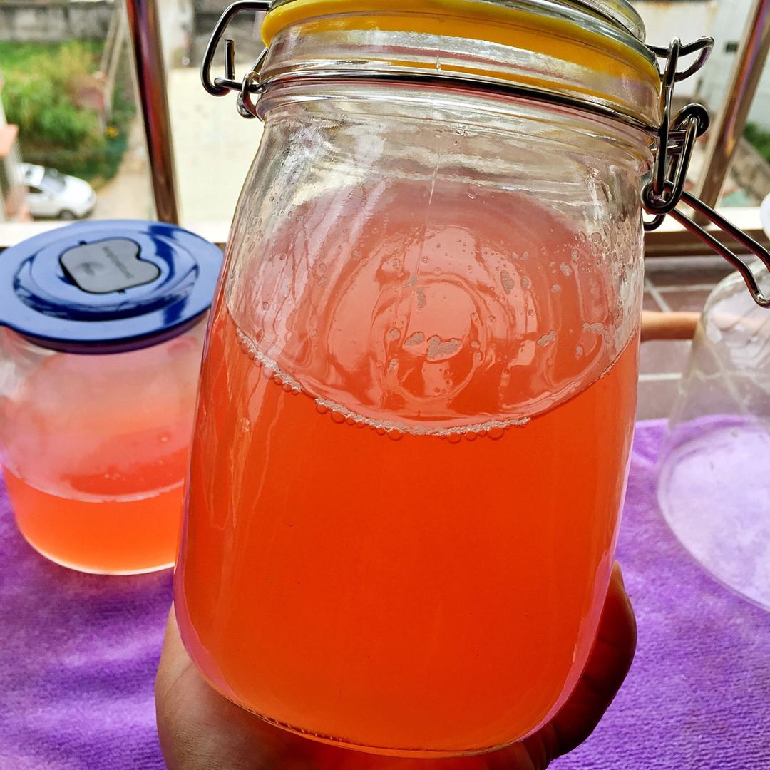 沙棘苹果鲜酿酵素。300g沙棘,200g苹果,400g冰糖,3L水,1.5g菌粉,蘑菇君80小时。