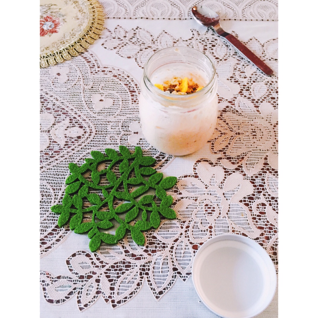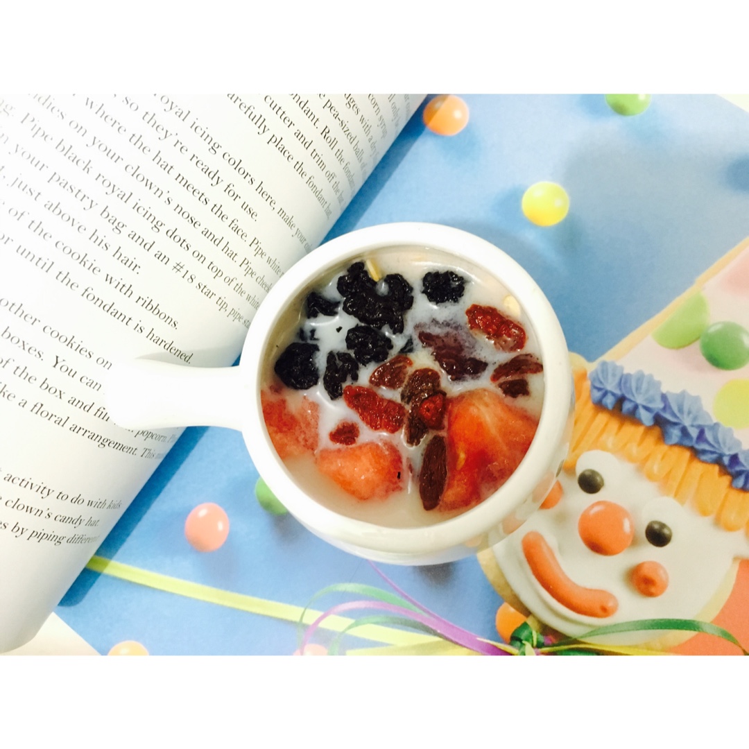 燕麦➕牛奶➕草莓果酱➕蓝莓干➕枸杞➕西瓜 【草莓果酱被遮住了好桑...