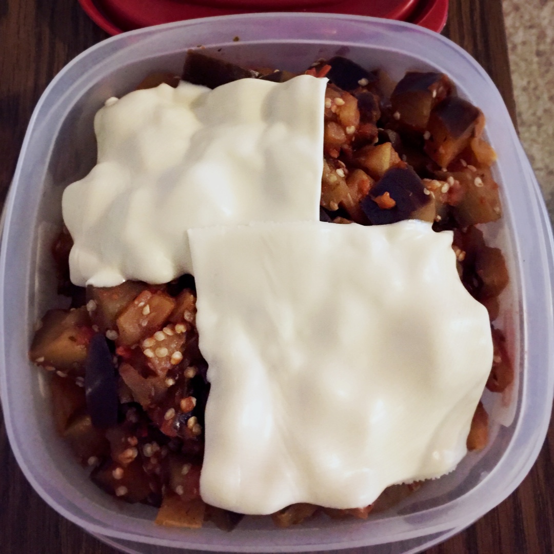 吃西红柿烧茄子啦~开了个脑洞放了奶酪,是素食奶酪~感觉味道还不错😋