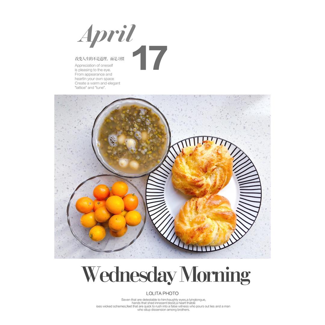 早餐:奶香椰蓉面包+绿豆莲子汤+金桔