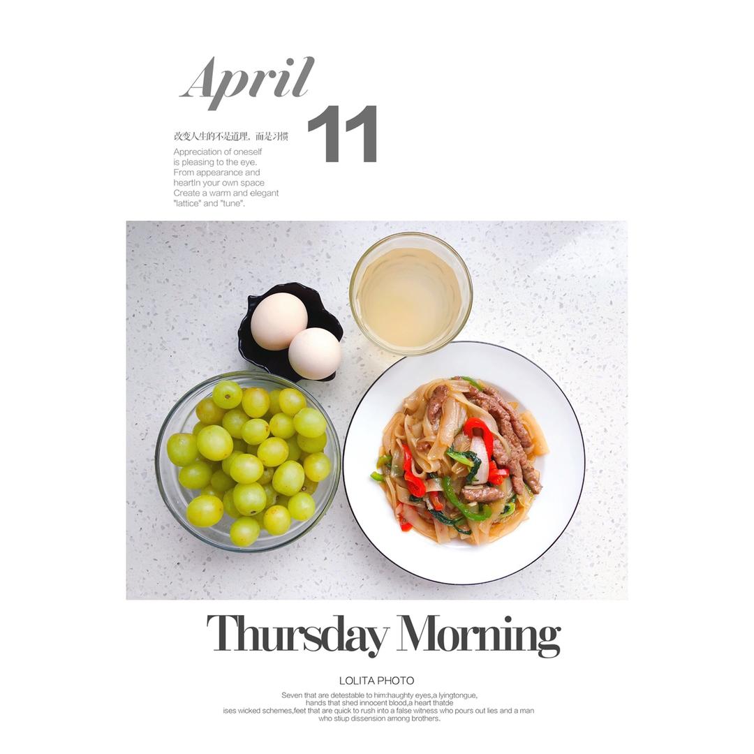 早餐:牛肉炒河粉+水煮蛋+蜂蜜柚子茶+无籽青提