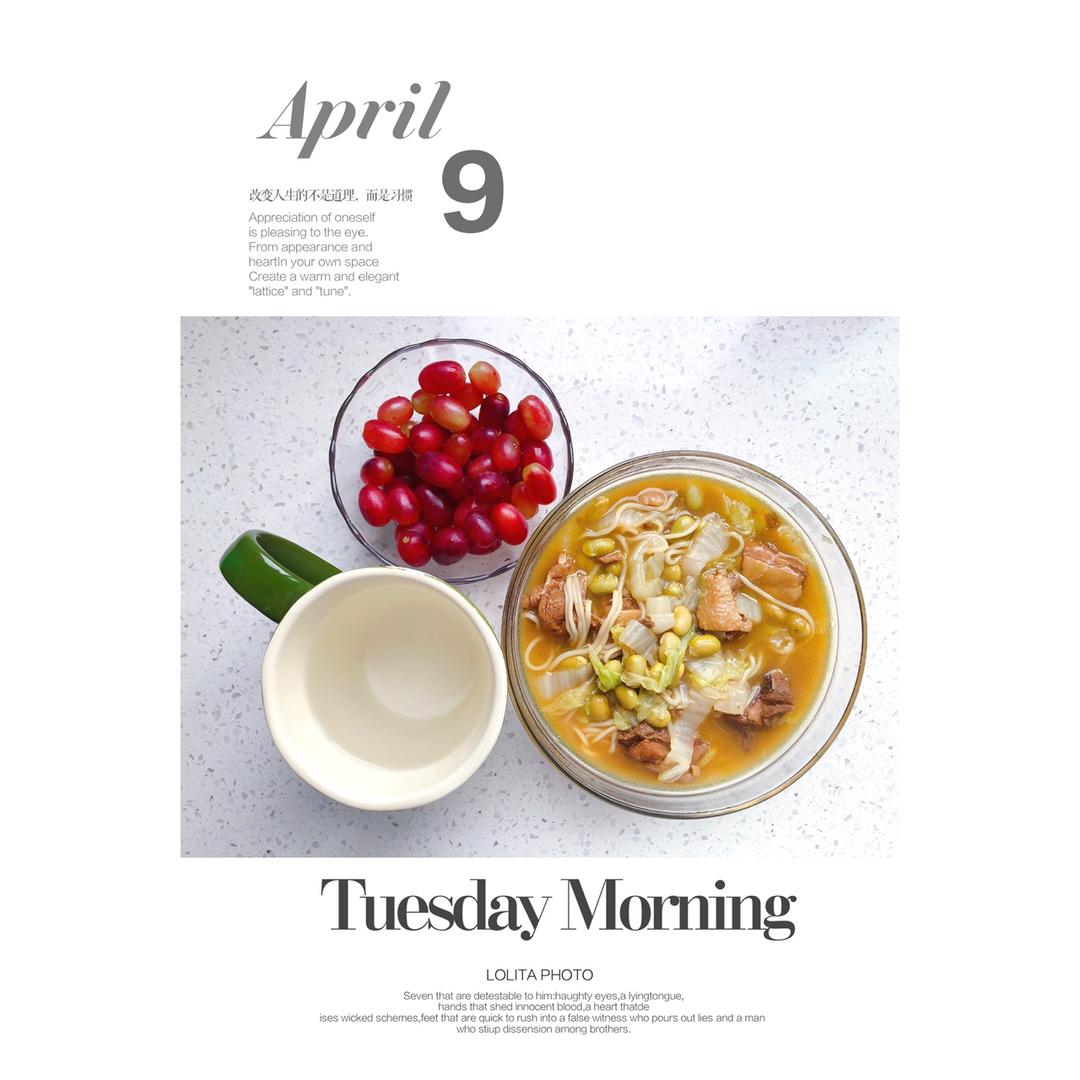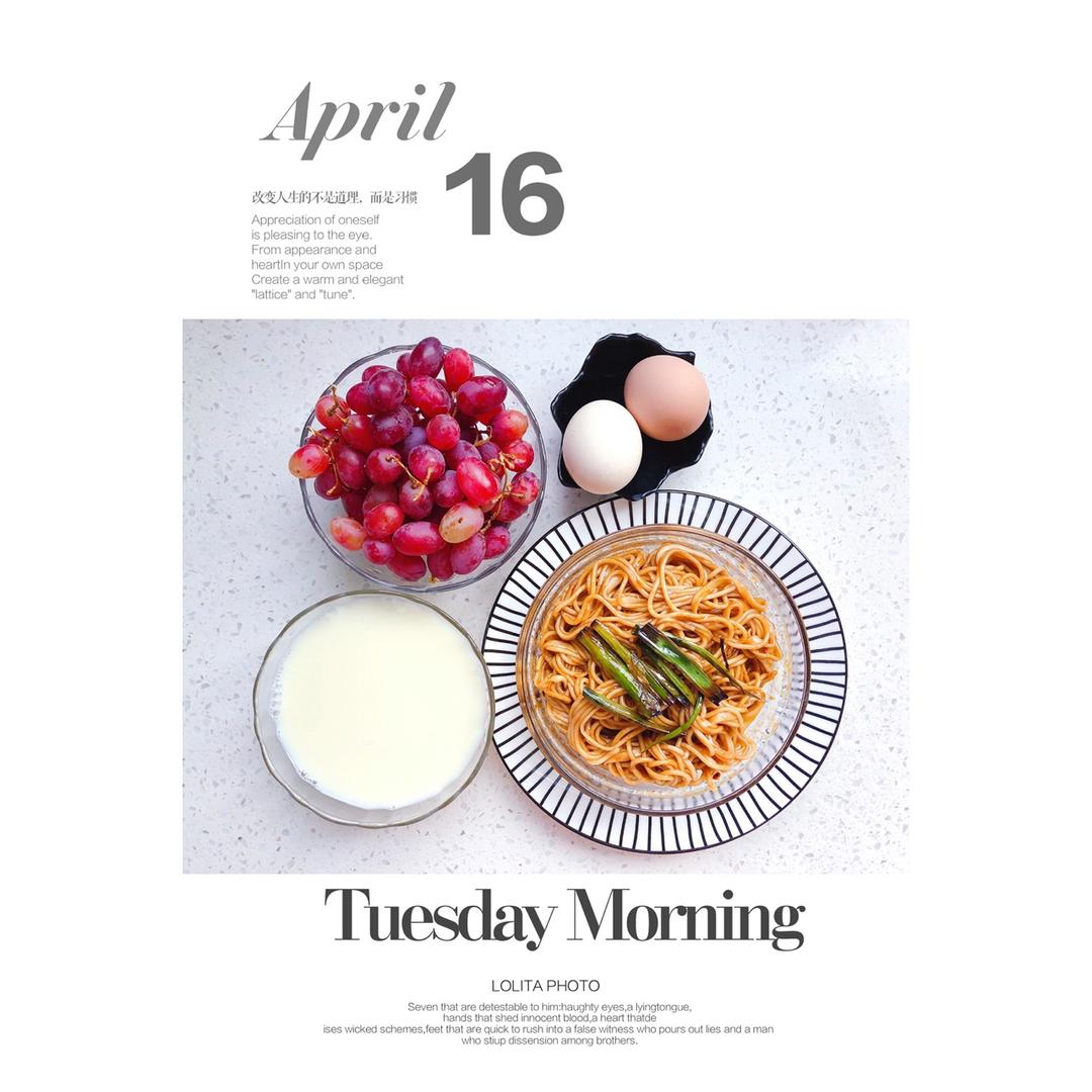 早餐:葱油拌面+水煮蛋+手磨豆浆+无籽红提