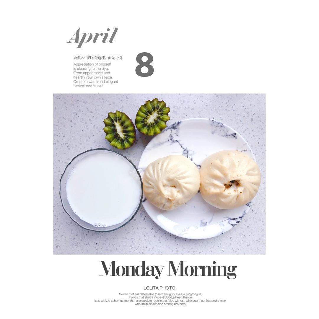 早餐:雪菜笋丁包+肉末粉丝包+热牛奶+猕猴桃