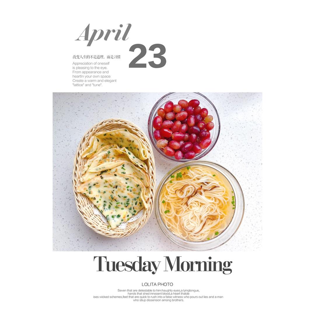 早餐:韭菜鸡蛋饼+上汤虫草花阳春面+无籽红提