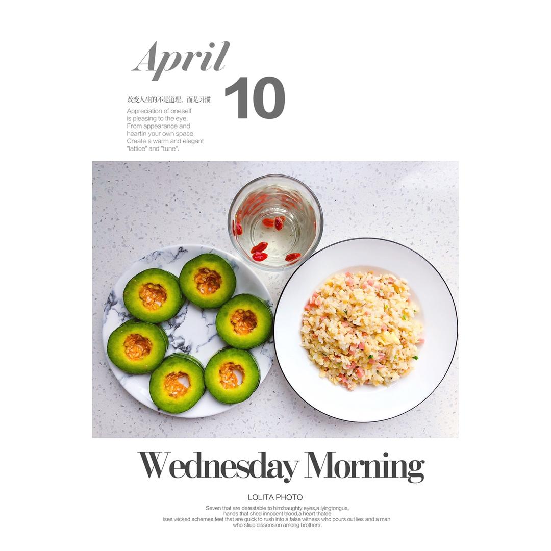 早餐:火腿黄金炒饭+枸杞茶+羊角蜜瓜