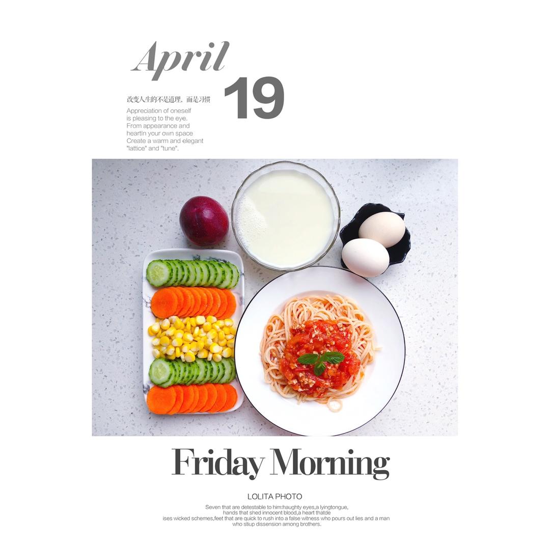 早餐:番茄肉酱意面+蔬菜沙拉+醇豆浆+水煮蛋+珠宝李