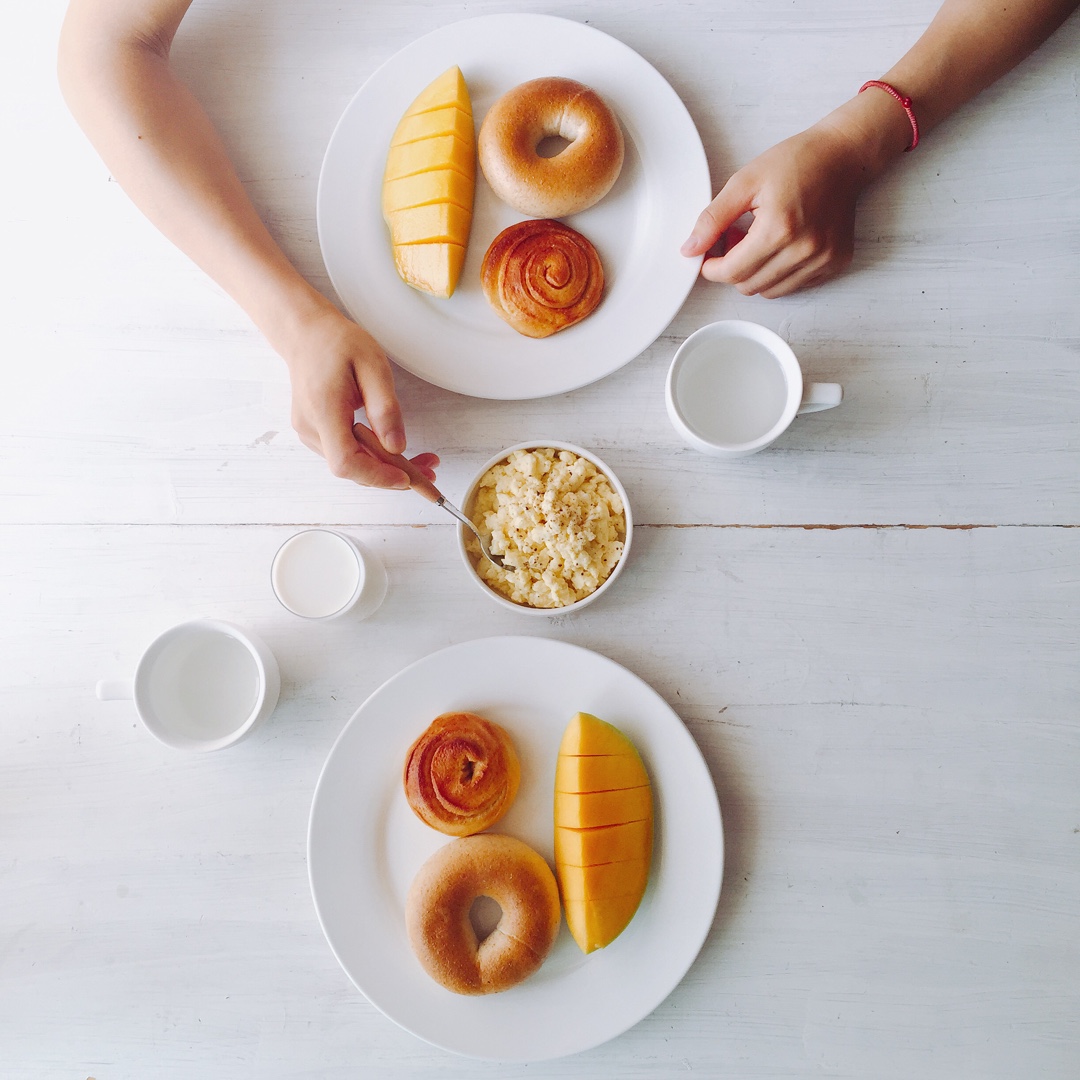 早呐~今天早餐是全麦贝果/肉桂卷/炒蛋/mango/牛奶!看上去量都那么少了 Molly还是嫌多了😒 #早餐•2016年...
