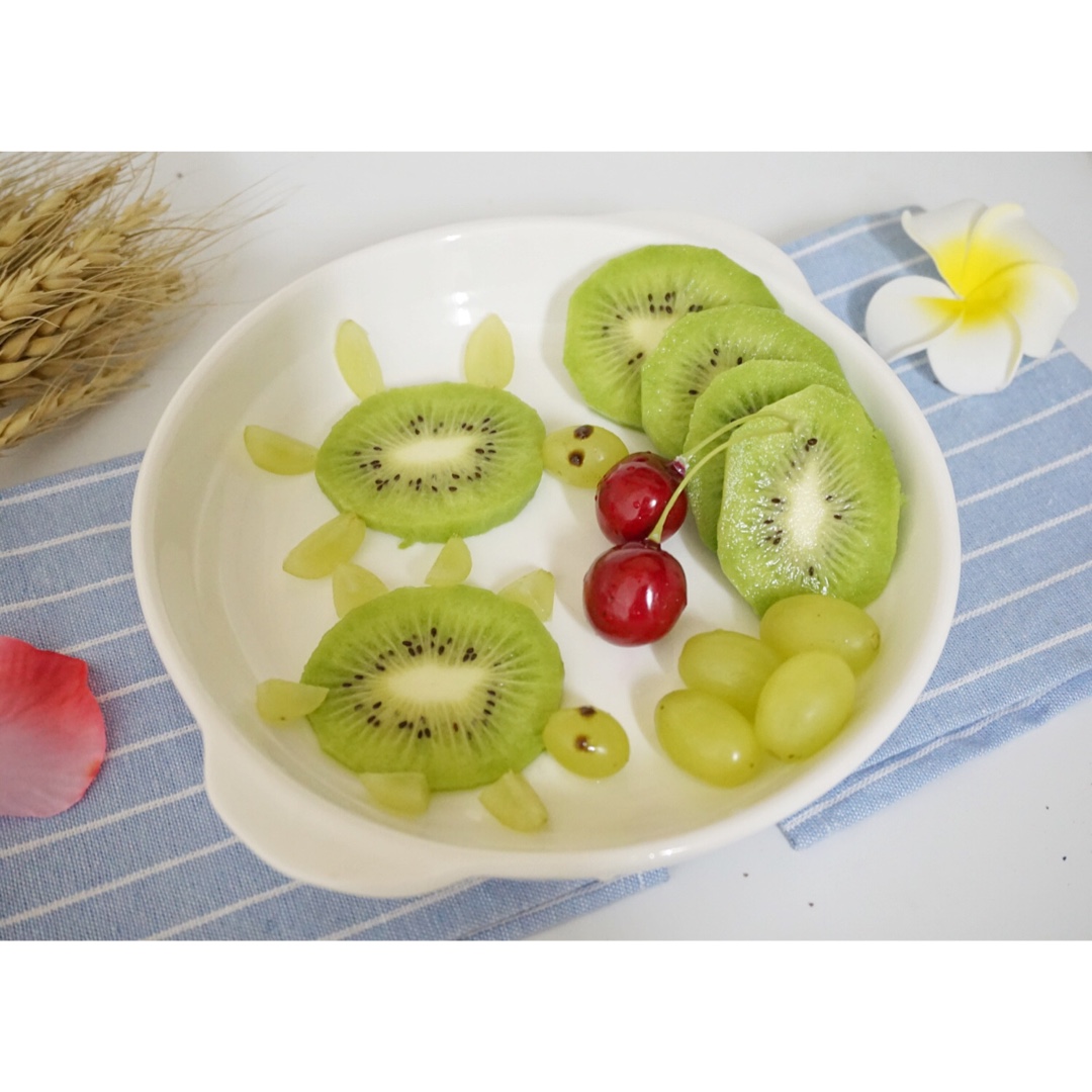 小乌龟的头部老掉出来,于是用牙签把作为头部的提子和作为身体的猕猴桃串起来了。不过,猕猴桃还没有熟好酸+_+ #嘿~今天...