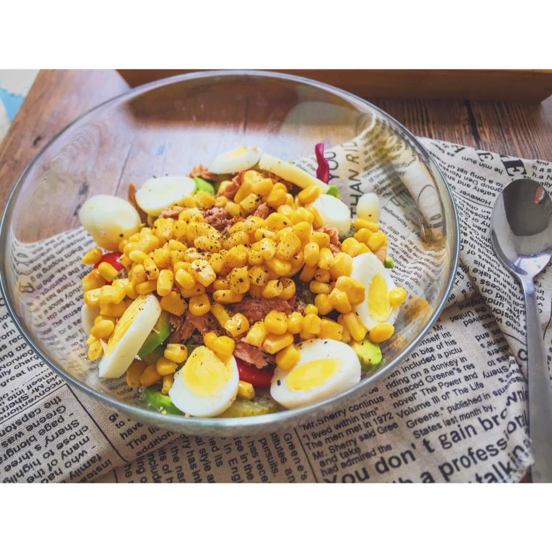🙈紫甘蓝+圣女果+牛油果+酸黄瓜+金枪鱼+玉米 +鸡蛋😂😂两口就饱了...