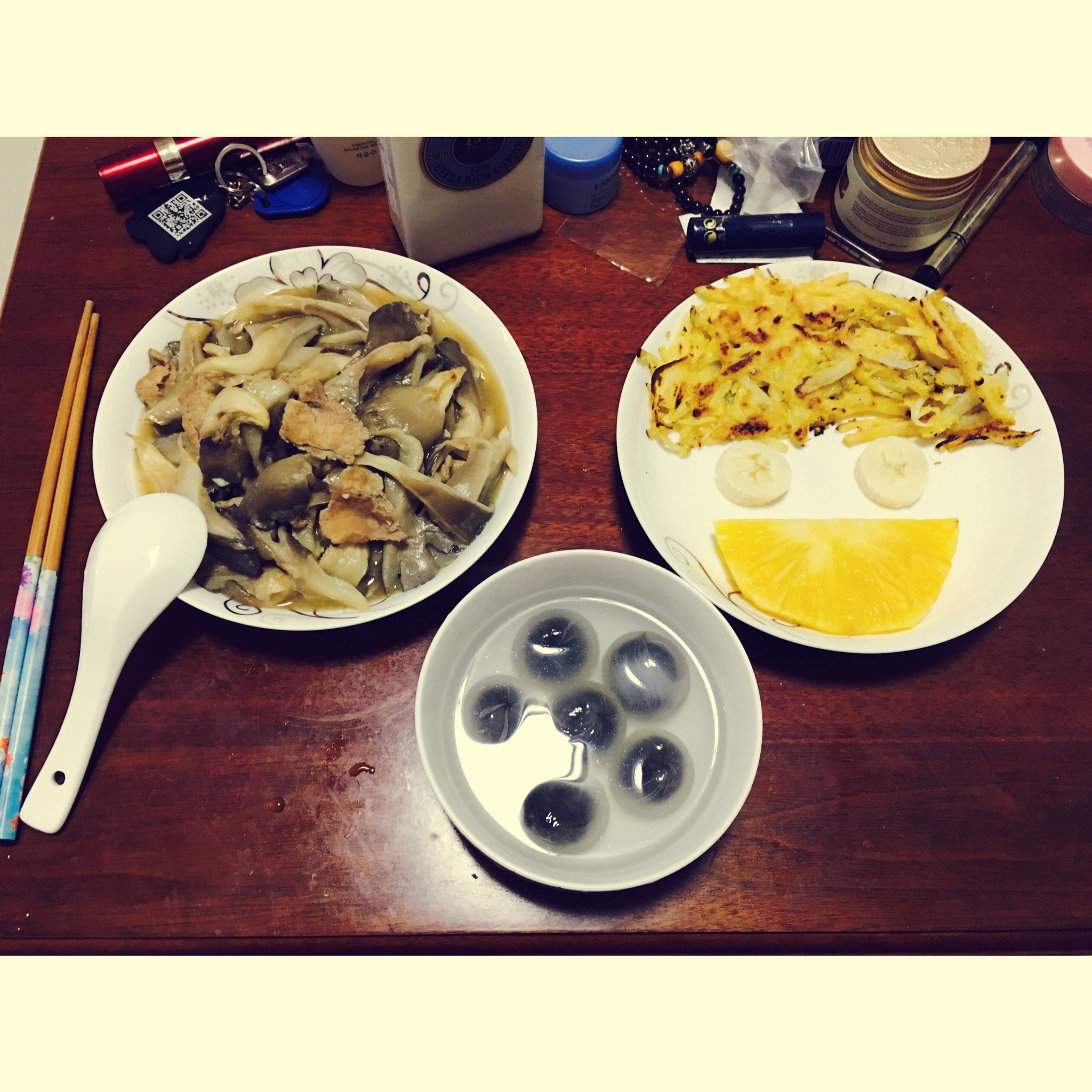 2016年2月22日·蘑菇🍄炒肉、土豆饼、汤圆&🍍+🍌,哟哟哟