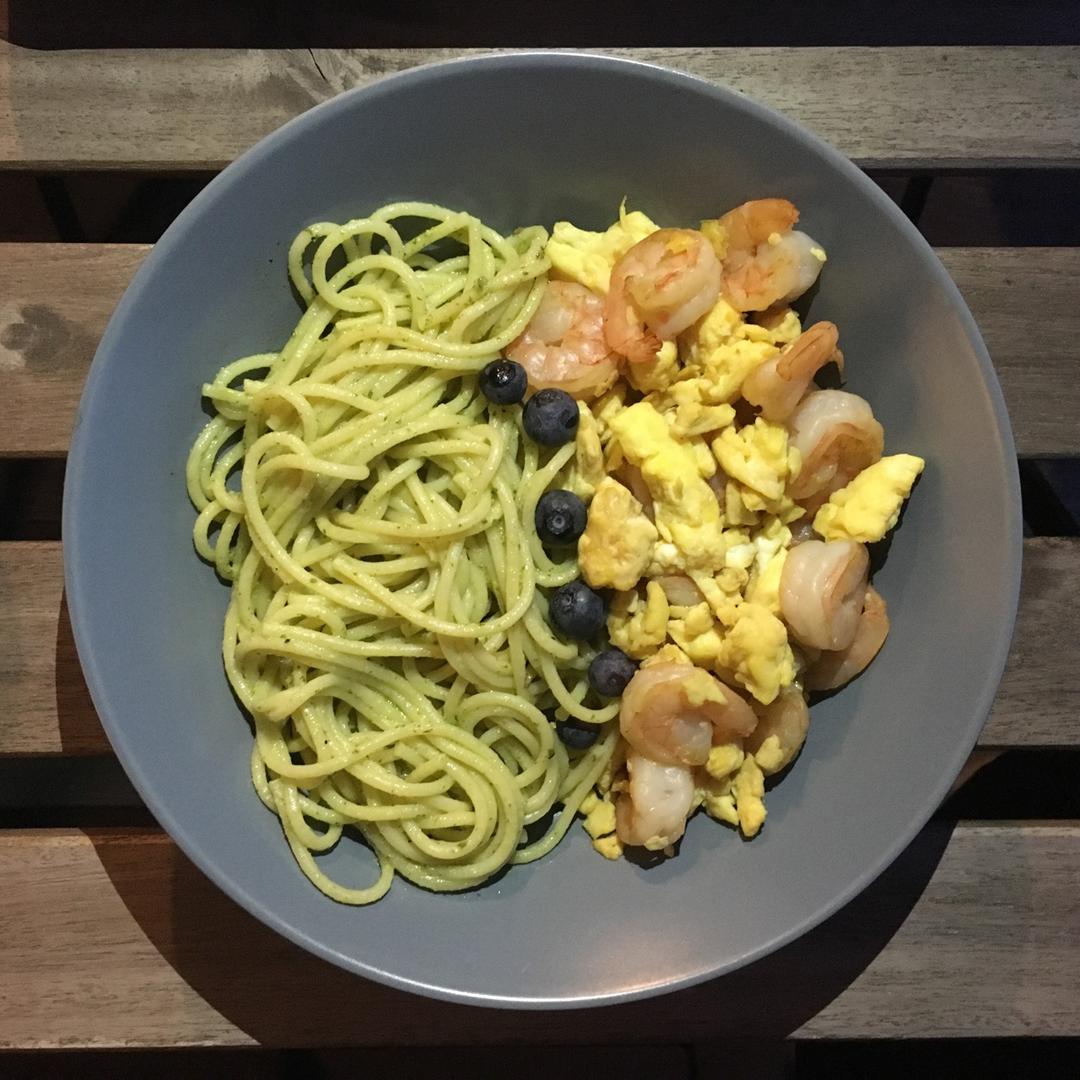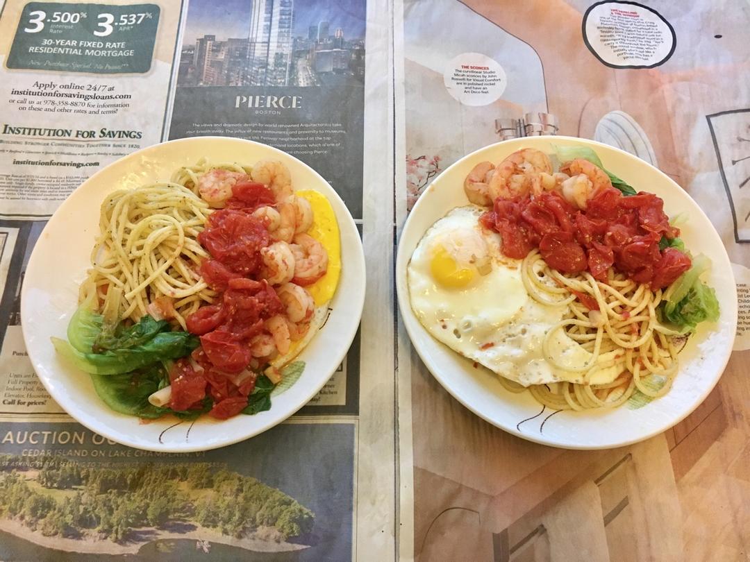 今天吃意面😃其实相当于做了番茄浓汁虾仁&青酱意面两个菜谱。如此混搭,只求意大利人不要追来打我…生菜还焖熟了😂完全...