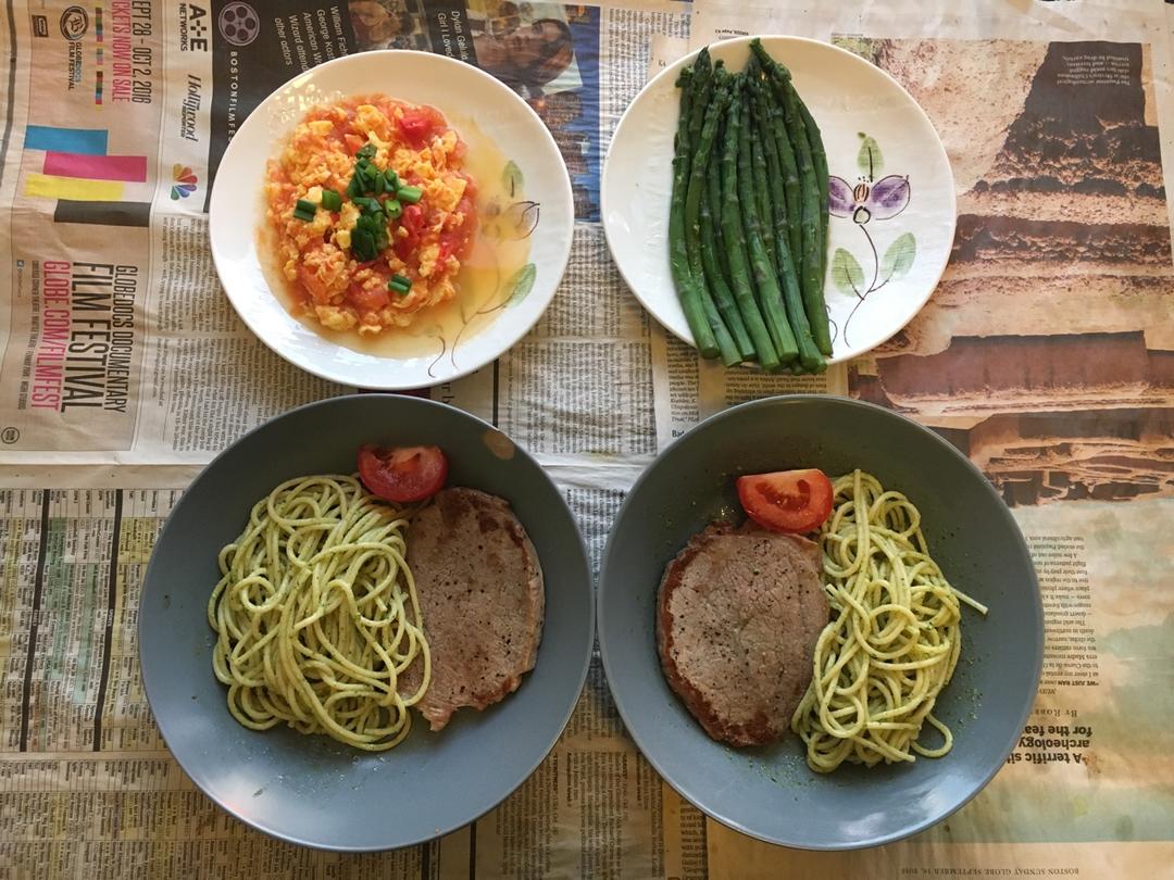 刚做的青酱,裹上意面还挺香的,加点黑醋中和一下油腻感。之前买的牛排快过期了,拿来练练手,煎得有点老。番茄也软掉了,只好用...