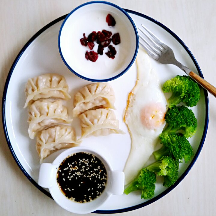 早安!饺子+煎蛋+西兰花+酸奶!