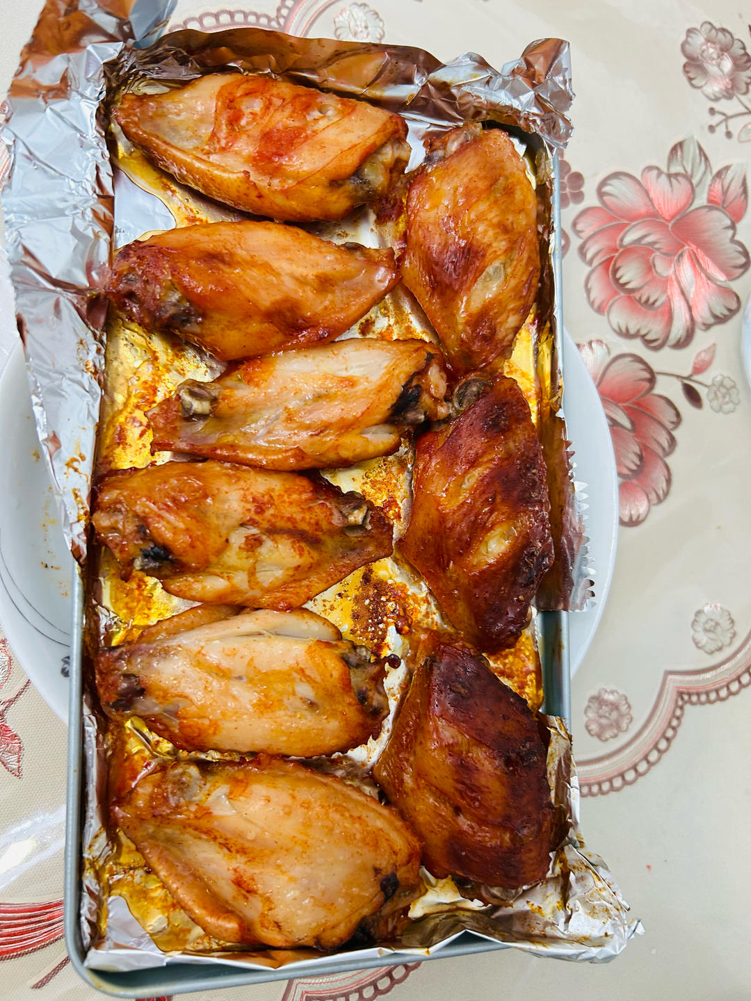 现成腌好的奥尔良鸡翅根,入烤盘,上下190度,25分钟。中途翻面一次。