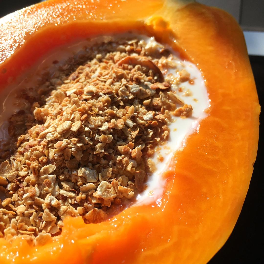 木瓜酸奶碗,如果挑到好吃的木瓜这个就好吃爆了,用勺子kuai着,一口里有木瓜、酸奶和燕麦,燕麦是自己烤的,用百香果糖浆调...
