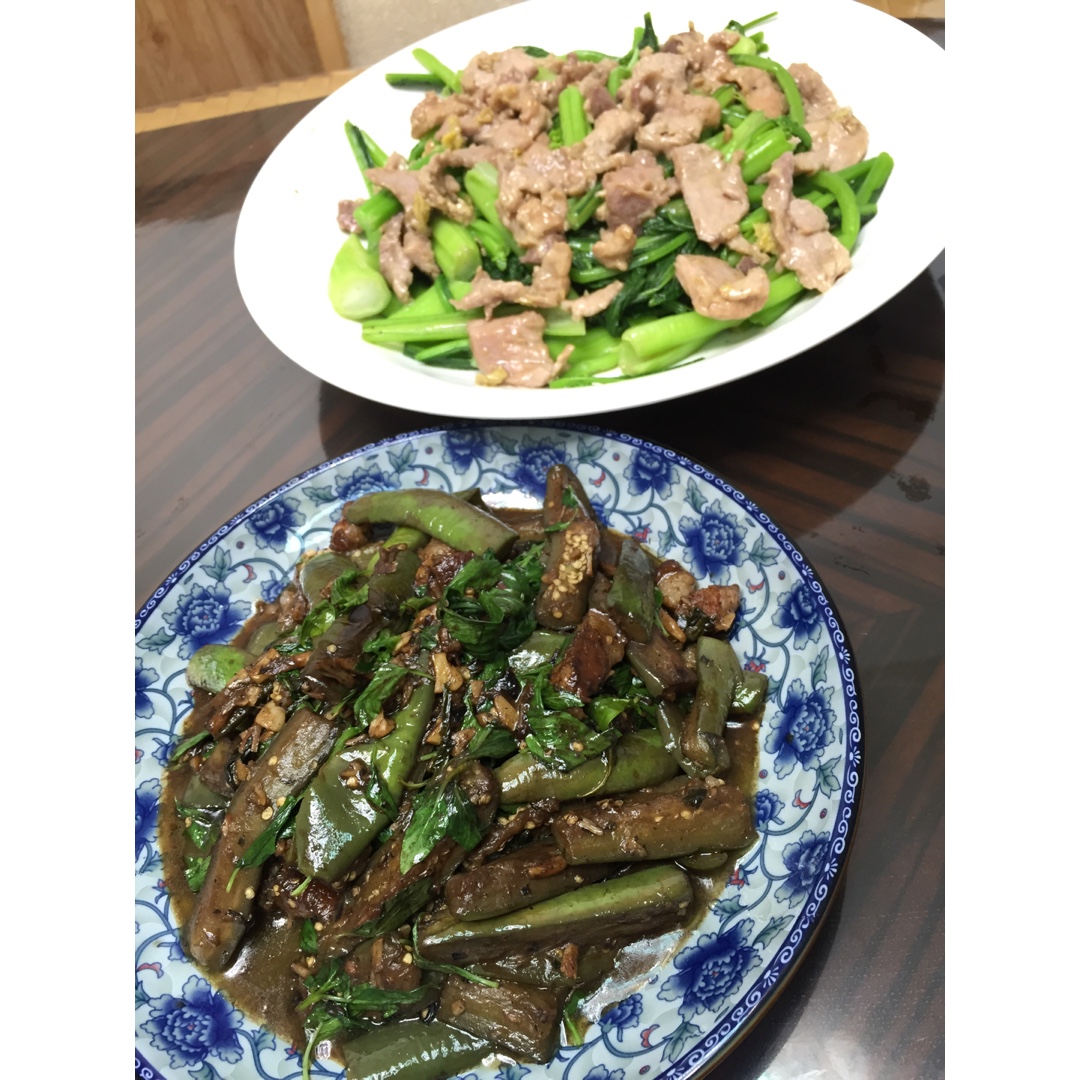 在家吃, 在家吃午饭. 我煮的九重塔茄子 和我爸炒的肉片青菜. 我妈就等吃.
