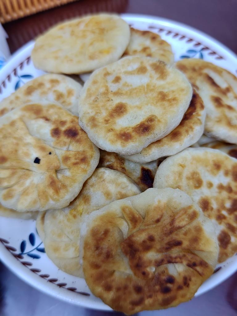 酸菜馅饼,肉丸子,蒜茄子
