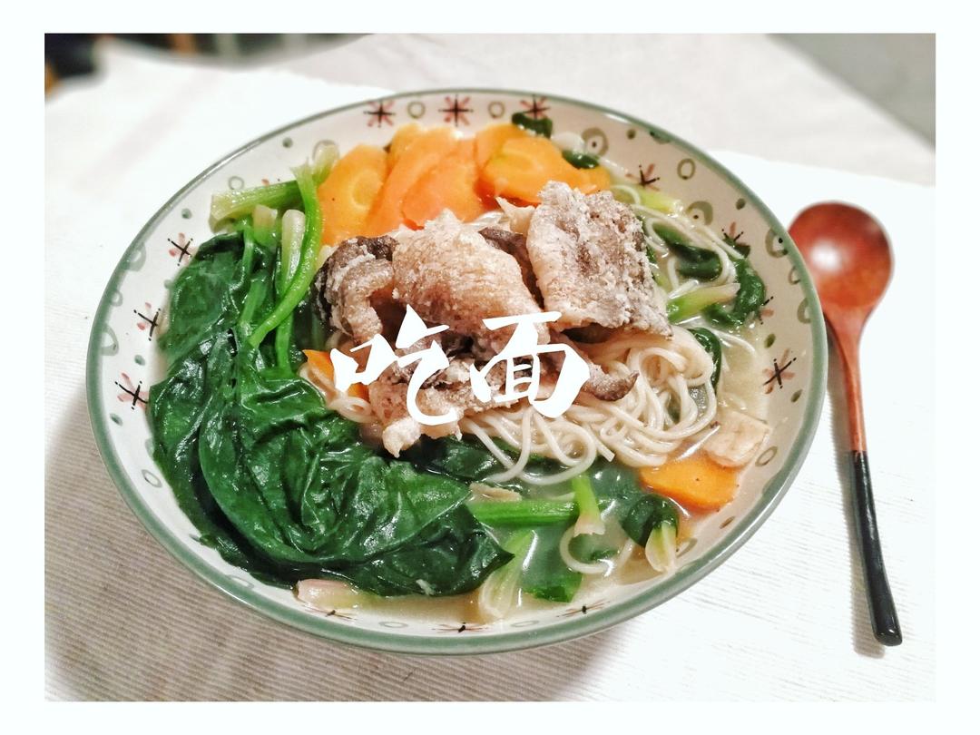 用牛骨汤做汤底,菠菜和胡萝卜配上脆脆的鱼皮,...