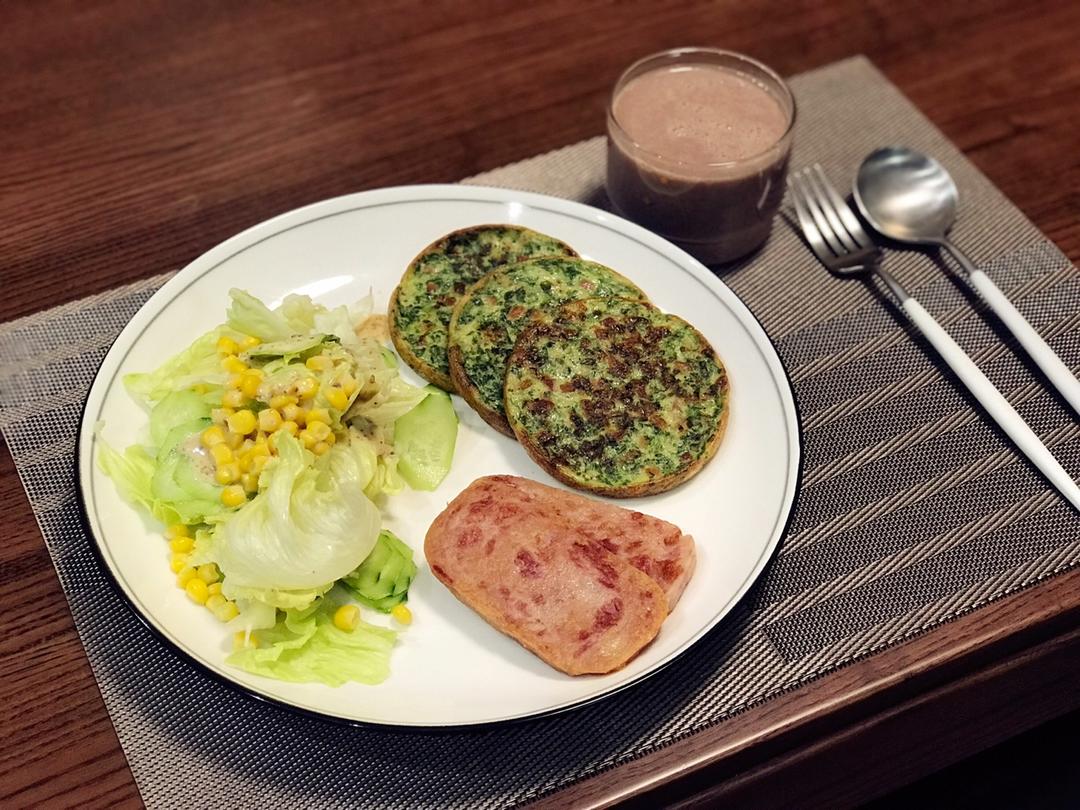 香菜培根鸡蛋饼+玉米沙拉+煎午餐肉+核桃红豆黑豆浆