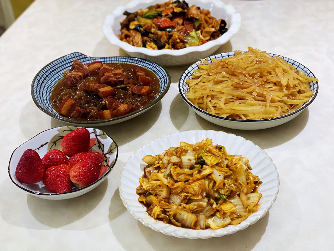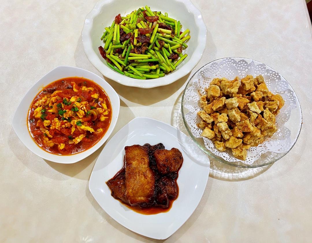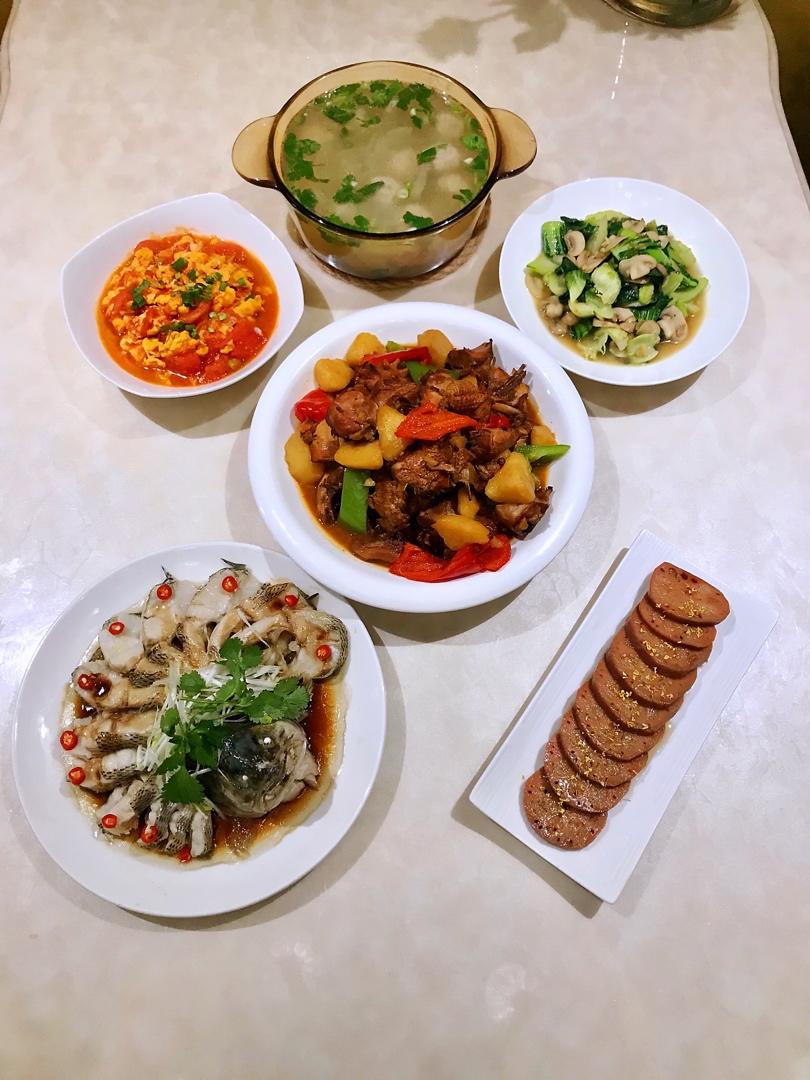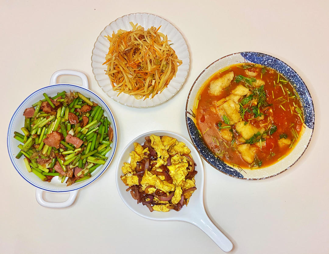晚餐:番茄龙利鱼➕土豆胡萝卜丝➕洋葱炒蛋➕蒜薹炒肉