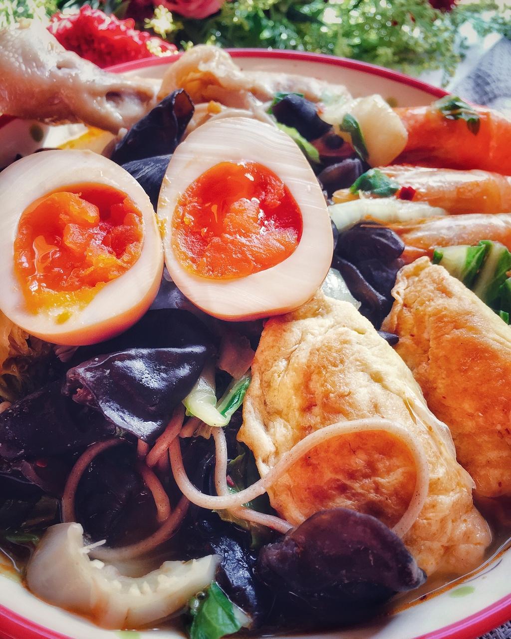 香肠酸笋杂蔬炒面+菊叶虾米汤。