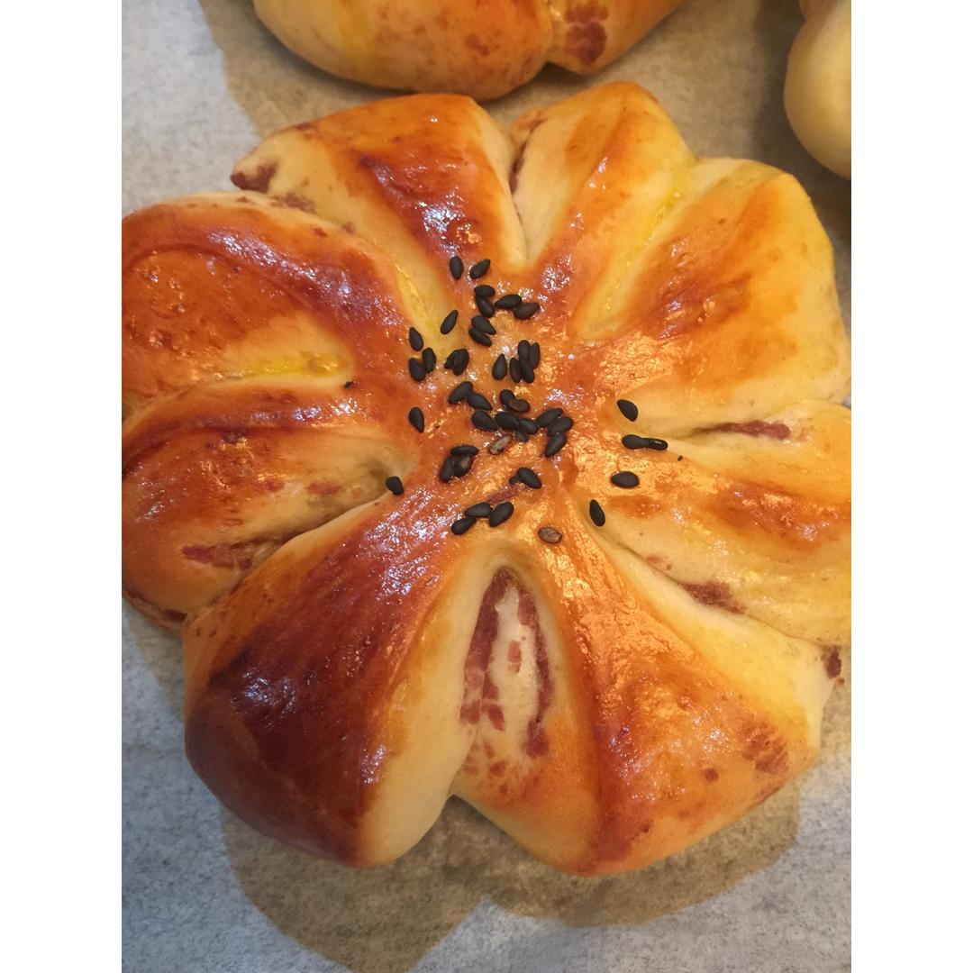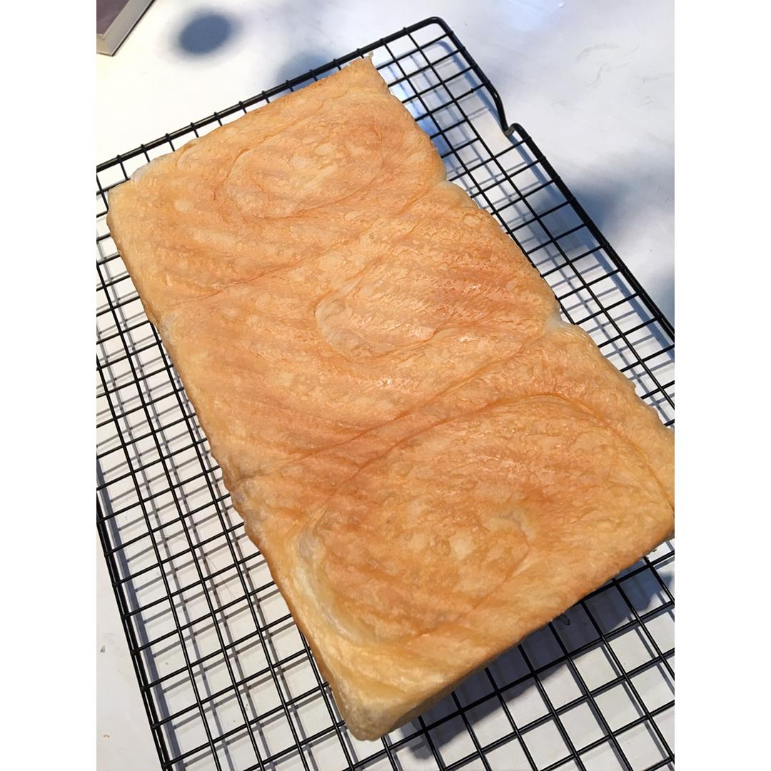 加入主面团后一直很粘揉不起来 加了10g粉立马好揉了 二发用了一个半小时 185度35分钟三能金波 上色刚刚好 组织明早...