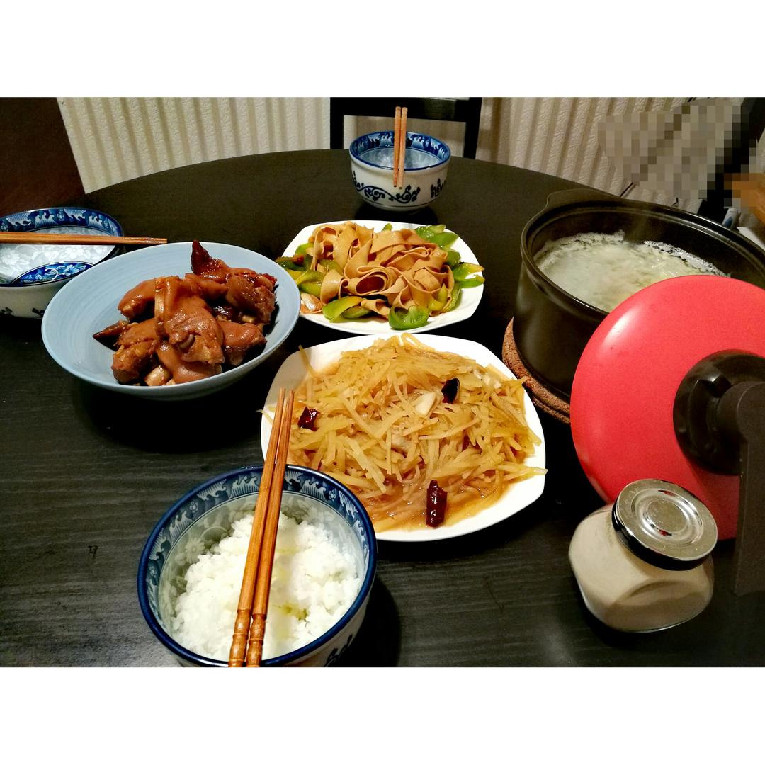 卤猪蹄,青椒豆皮,酸辣土豆丝和排骨萝卜汤(最近我家的最爱😁放适量的白胡椒粉,喝完微微出汗...