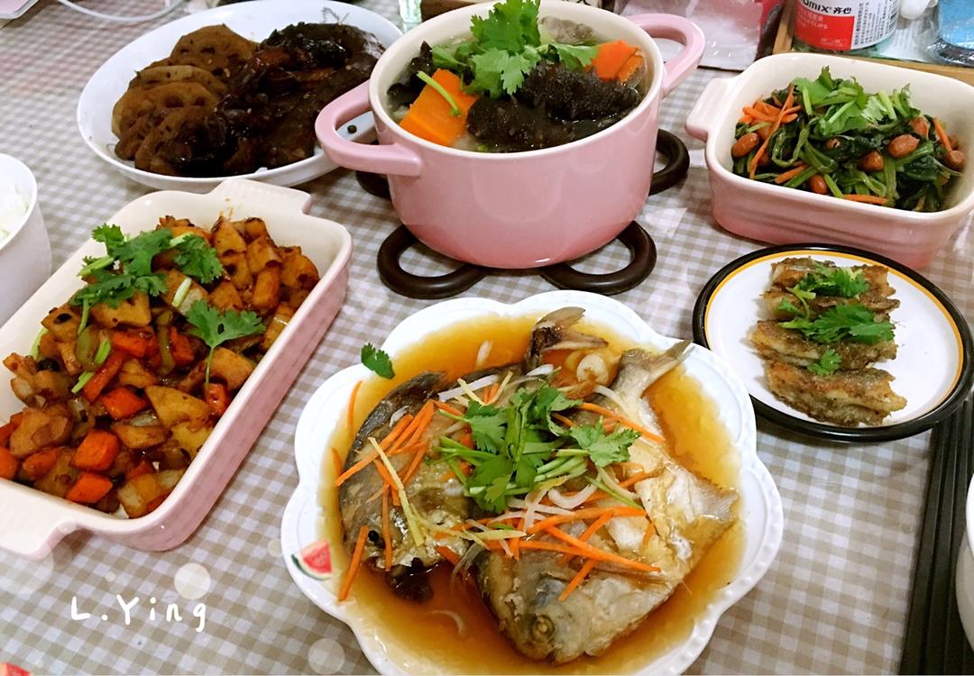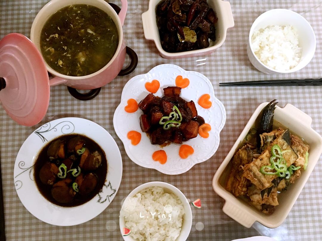 红烧肉➕酱爆牛牛➕自制周黑鸭➕炖鲅鱼结子➕紫菜海参花汤=完美
