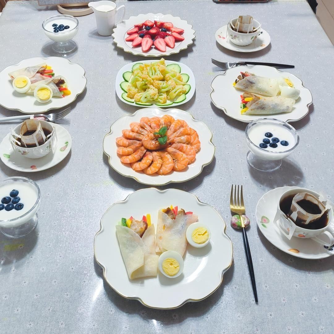 周末早午餐:烤鸭蔬菜卷饼鸡蛋,糖醋虾素炒菜花,水果摆盘之花开富贵,酸奶,挂耳咖啡。