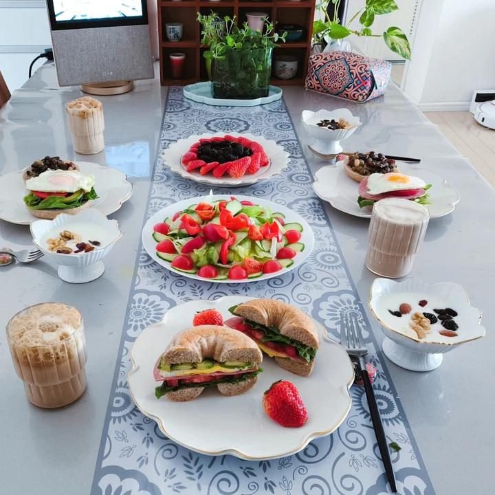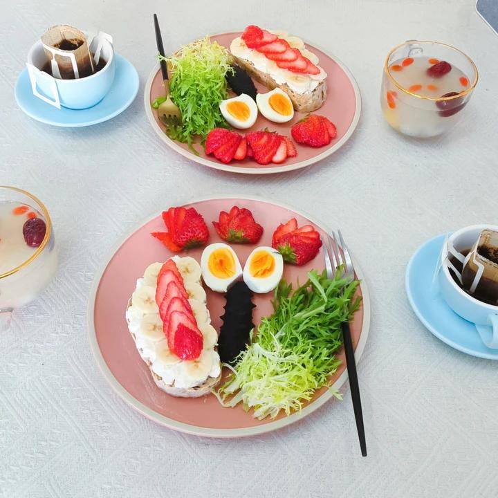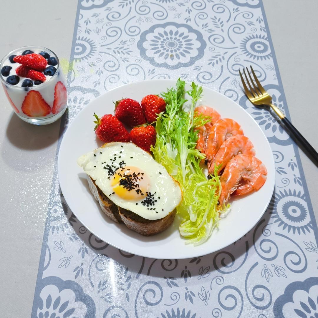 早餐:黑芝麻全麦欧包丑丑哒,但营养又美味,欧包煎蛋开放式三明治,苦苣草莓水煮虾,水果酸奶杯,咖啡。#早餐•2...