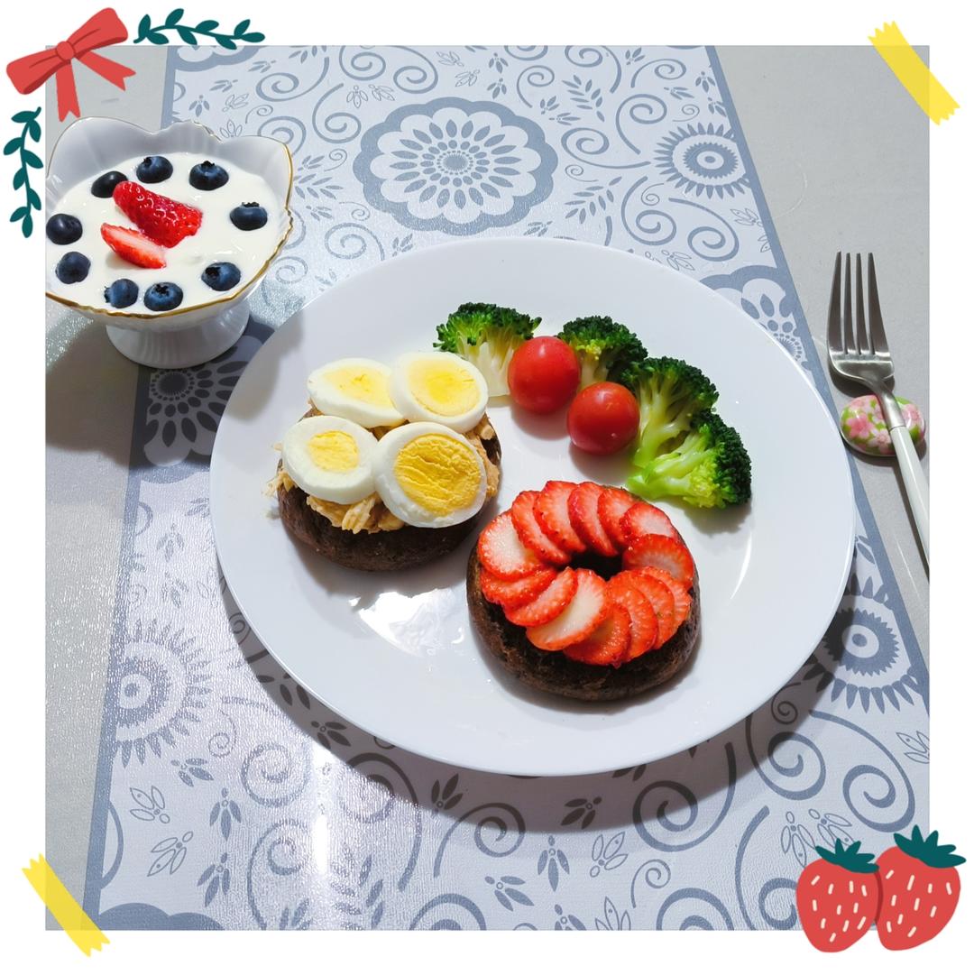 早餐:昨天烤的全麦黑芝麻贝果,卖相差了点,但不影响当早餐哟!开放式贝果双拼三明治,鸡胸肉鸡蛋贝果,草莓贝果,水果酸奶,银...