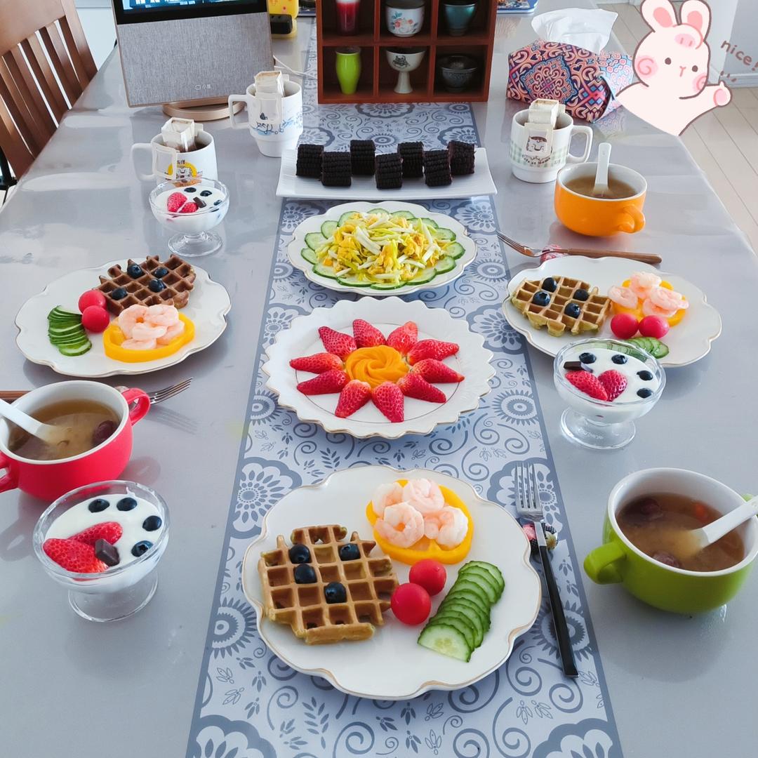 周末早午餐:华夫饼,黑玉米,虾仁黄瓜小番茄,韭黄鸡蛋小抄,水果摆盘,银耳红枣枸杞羹,水果酸奶,咖啡。