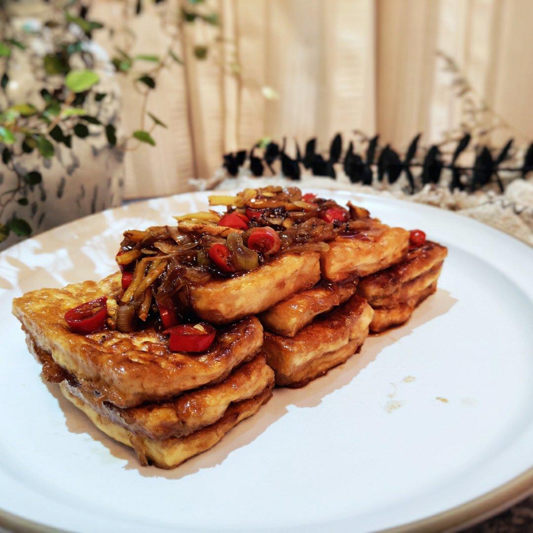 老豆腐煎好,调个酱汁再煮一下,超级好吃😊