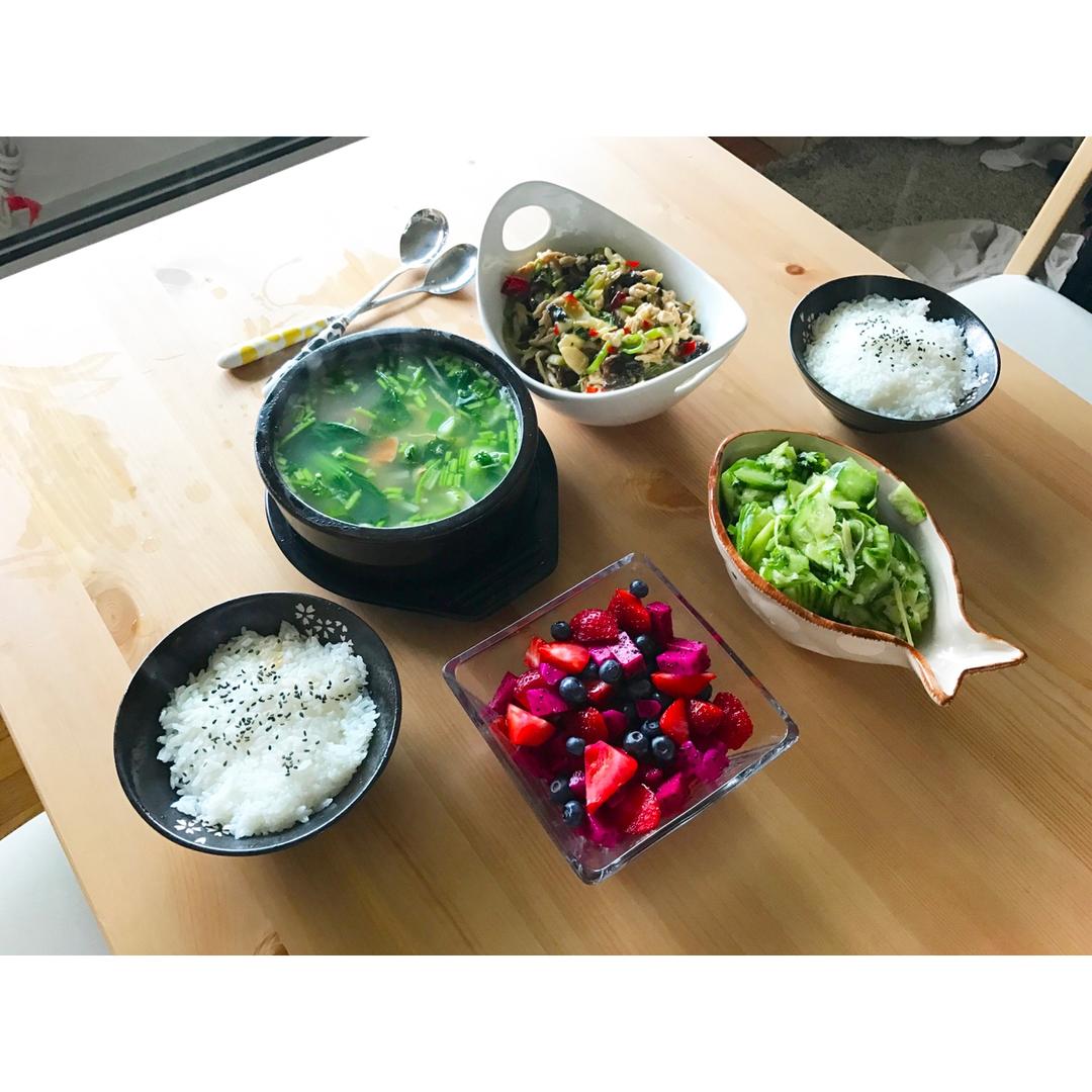 其实这是周日的午餐~本来只有一个鱼香肉丝,觉得不够吃就加了凉拌黄瓜,后来又加了青菜汤,还有日常水果…