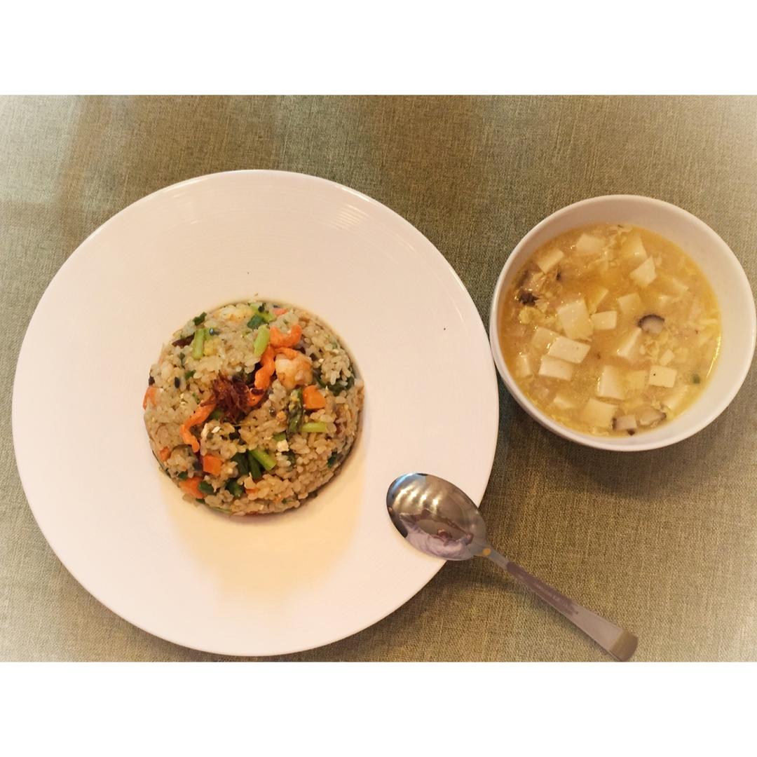 买不到虾仁,买了明虾三只(做了三人份的炒饭),虾头熬油后又煮了汤汁,沥尽虾头渣后烧了三份豆腐蛋花羹,真的太美味了! #晚...