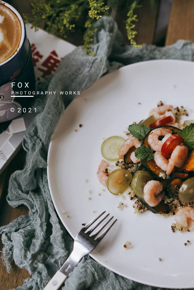 日食记——烤南瓜、清炒虾仁、水煮藜麦、葡萄、奶咖