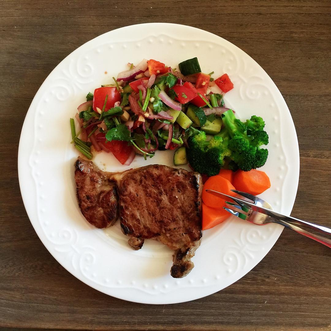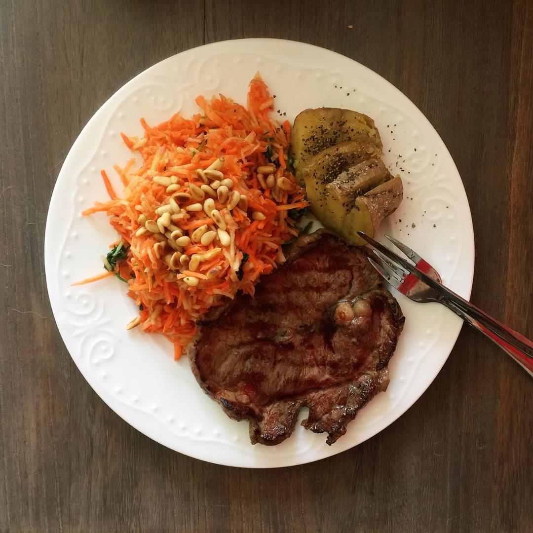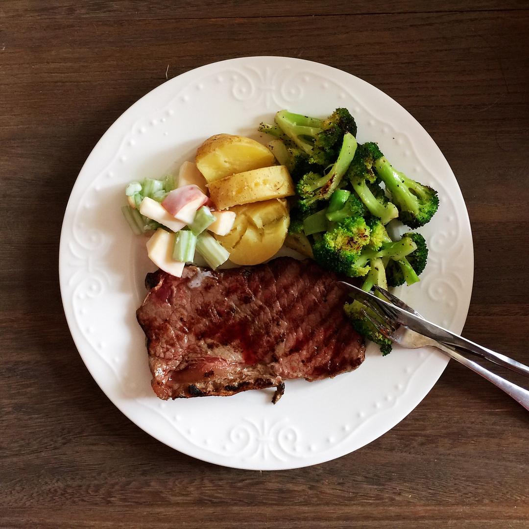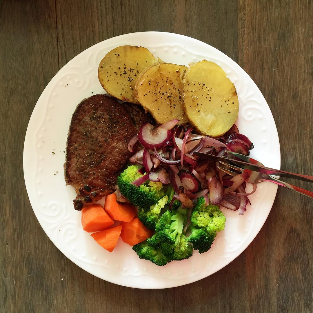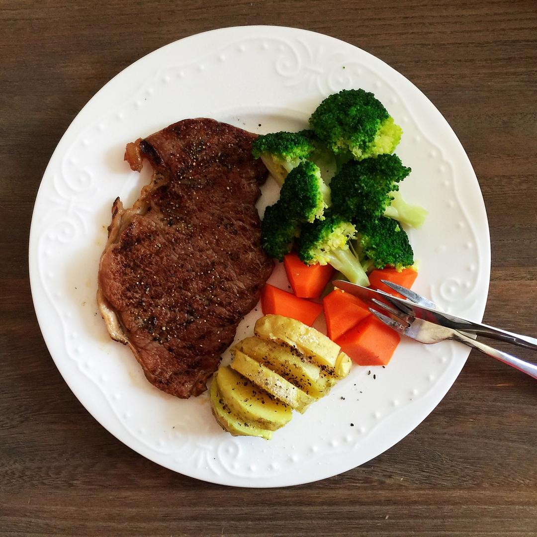 早上不到五点就起床出门办事,好在一切顺利,还来得及回家吃牛排~基础款,西兰花胡萝卜加土豆就足够了。 #午餐•2018年5...