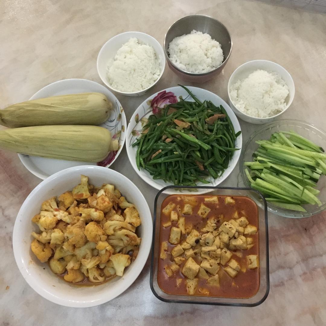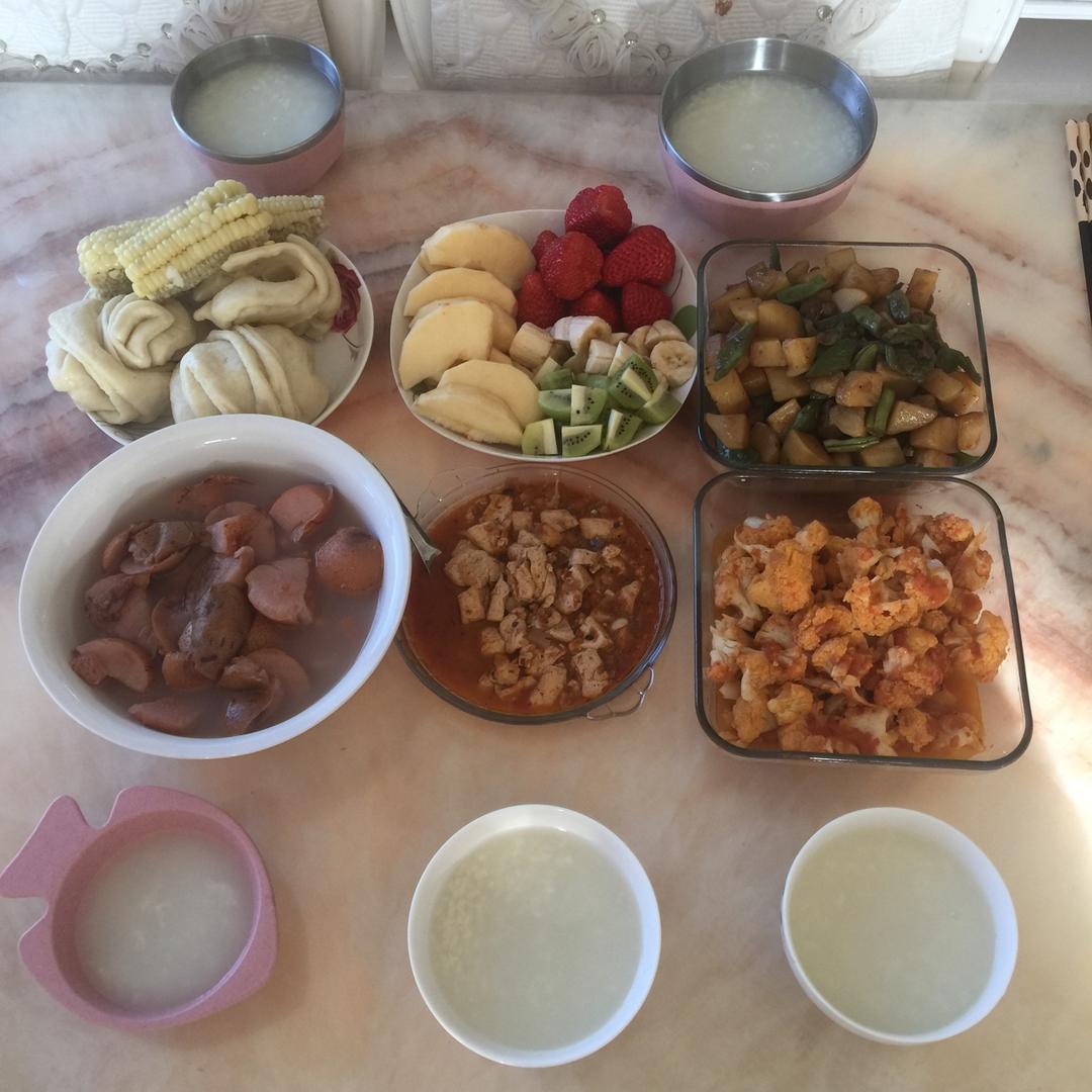 【纯素早饭】:土豆炖豆角,西红柿菜花,麻婆豆腐,煮酸梨汤,花卷,🌽,水果(🍓+🥝+🍌+🍎) #早餐•2018年2月11日...
